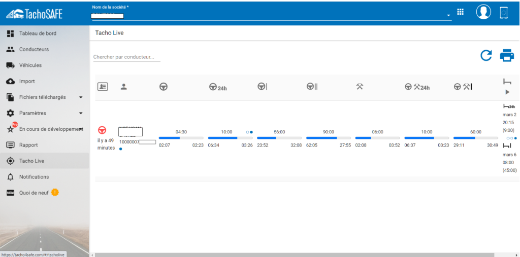 - Information sur le temps de conduite restant à faire dans la journée, la semaine et sur 2 semaines consécutives